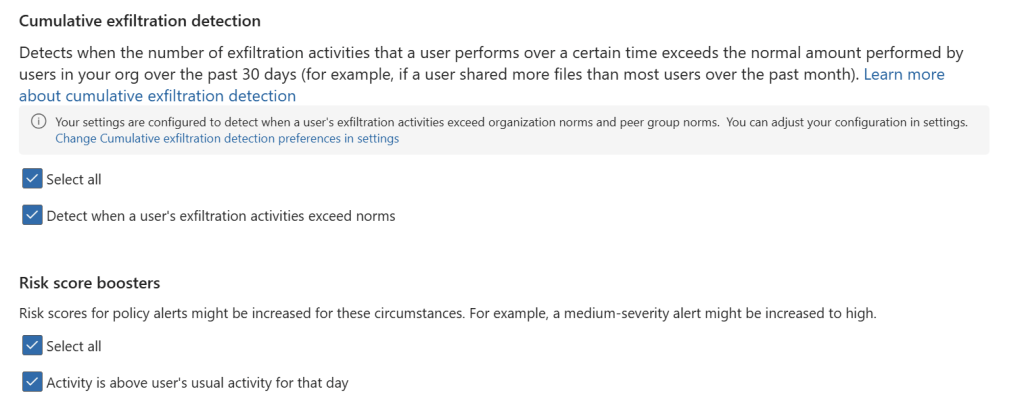 In the ‘cumulative exfiltration detection’ screen, we can configure whether the service should detect when the exfiltration activities that a user performs over a certain time exceeds the normal amount for users in your org over the past 30 days. This can then be used to boost the risk score in your policy.