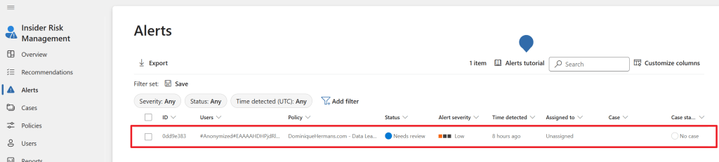 Now let’s return to our admin user and select the ‘Alerts’ screen in IRM. We can see that an alert is generated for a user (which cannot be seen because we choose to pseudonymize usernames) and the status for the alert is set to ‘Needs review’. We can also see that the alert is not yet assigned to a user tasked with taking care of alerts and no case has been generated yet.