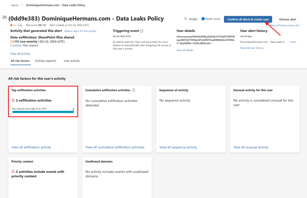 When the alert is opened, we are provided with a whole world of details. What was the triggering event (which I might have slightly manipulated for the policy to trigger π), the top exfiltration activities, the severity of the alert and some other details. Let’s confirm the alert and create a case by clicking ‘confirm all alerts & create case’.