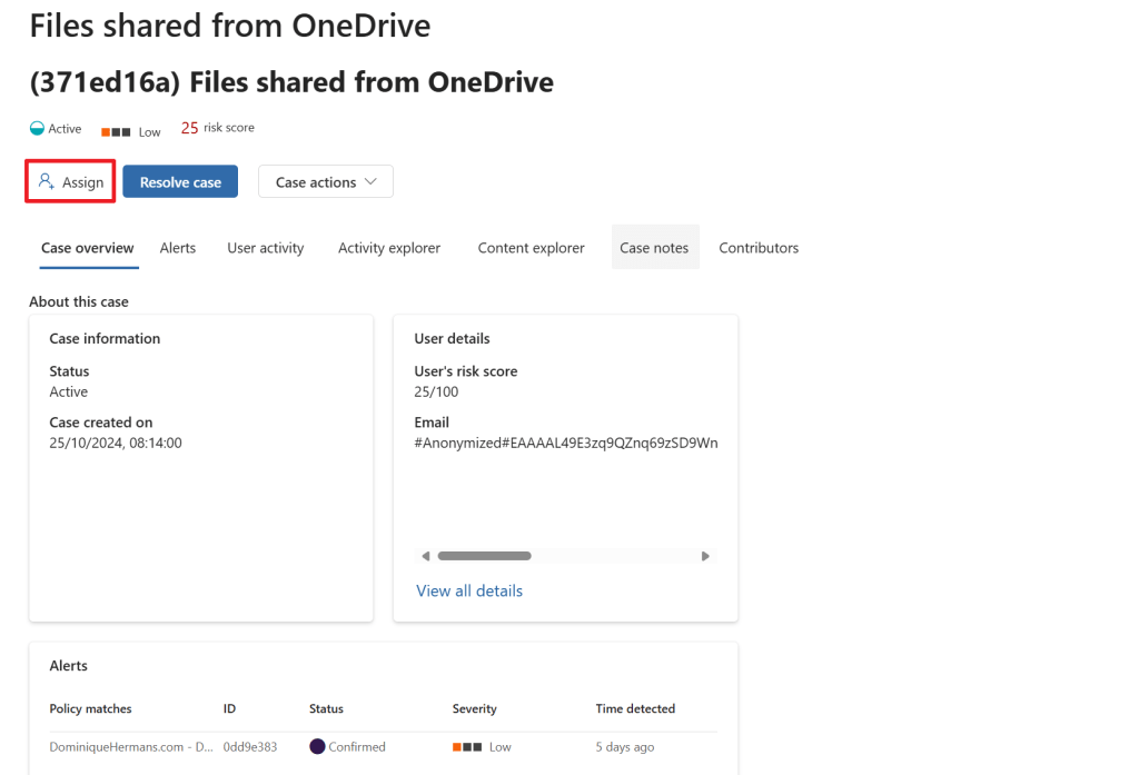 After moving to the cases screen in the IRM portal, select the case we just created and let’s assign it to a fellow IRM employee to start reviewing the case. Let’s go through each tab of this interface to see what information is provided to us via the case. Note that a case can have multiple alerts attached to it, in this demo it is only 1 alert, which can be seen on the ‘alerts’ tab.