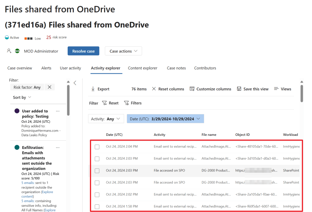 When we select the ‘activity explorer’ tab we can dive a little deeper by taking a look at all the activities the service linked to this case. This really shows a nice detail of what is going on. We can even take a look at the content included in the case from the ‘content explorer’ tab. Really nice to have all this features in 1 GUI.