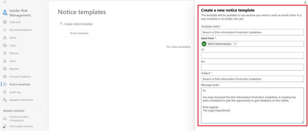 Now, with our case created let’s create a notice template by navigating to IRM, Notice templates. These templates can be used as a starting point to communicate about a case with a user involved in this case. I drafted up the one that is shown above.