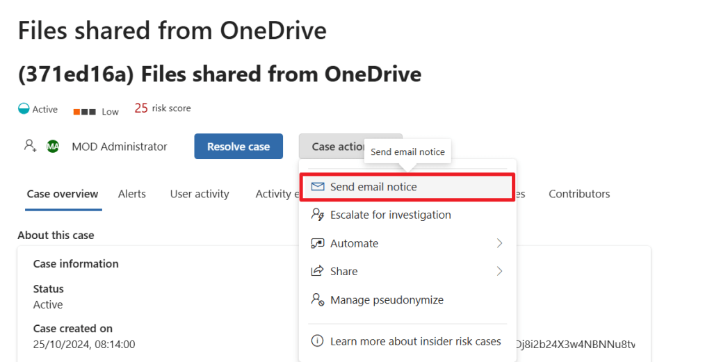 Let’s return to the case we’ve created and select ‘case actions’. It provides us with a few options like escalate the case for investigation, which actually opens an eDiscovery (premium) case in your Microsoft 365 environment that allows the IRM case to be further reviewed, for example for legal purposes. We can also apply a Power Automate action or share the case. Lastly we can manage the pseudonymize options for this case.