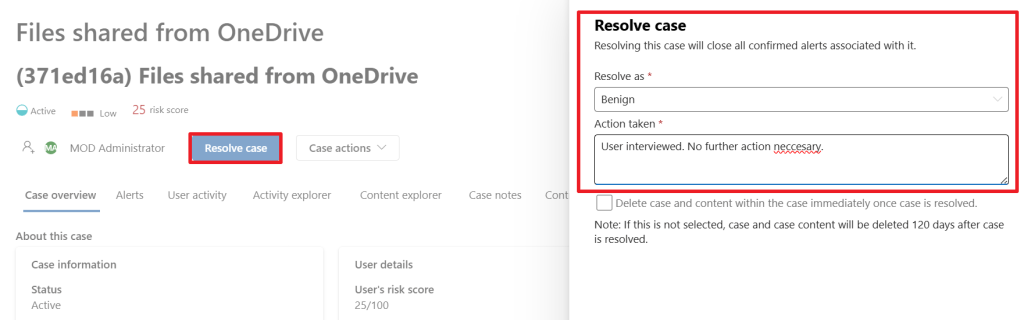 Lastly, depending on the input of our user, the case would be resolved as ‘benign’ which closes the case as no further action is necessary. It’s also possible to resolve the case as a ‘Confirmed policy violation’ in which case you have to take appropriate actions depending on the severity of the case.