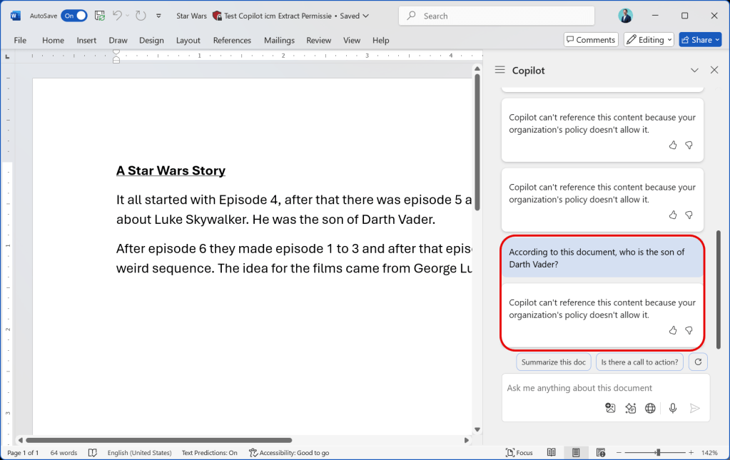 Just like in the previous article, I’m going to use the document about my favourite movie franchise of all time, Star Wars which, in this case, I have labeled with the ‘Test Copilot icm Extract Permissie’ label. This label is configured as in the above ‘Configuration’ chapter; with the M365 Copilot DLP rule AND the EXTRACT permission removed.
