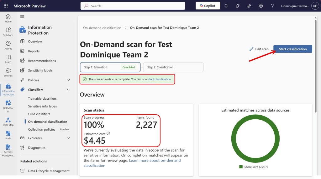 Now the ‘estimation’ mode starts. In this phase, on-demand classification will take a look at the included SharePoint sites and OneDrive accounts and provide you with an estimate of costs that will be incurred for classification of your resources. Click the scan and choose ‘View estimation’.