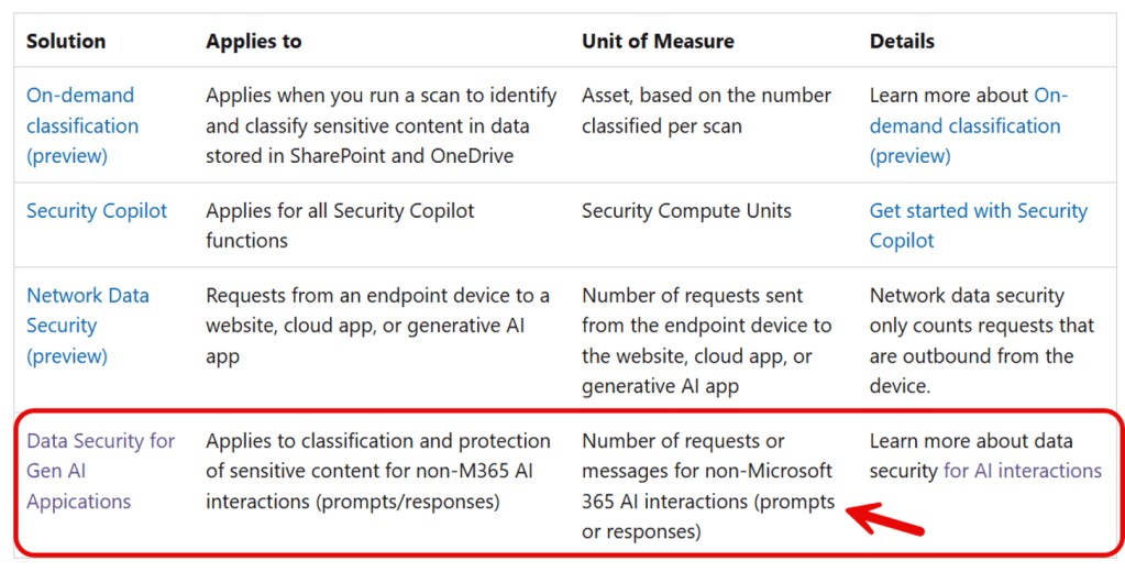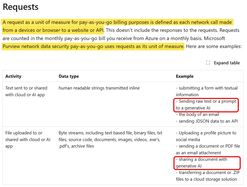 The answer can be found in the table above. The solution ‘Data Security for Gen AI Applications’, which applies to ‘classification and protection of sensitive content for non-M365 AI interactions (prompts/responses’) has ‘Number of requests or messages for non-Microsoft 365 AI interactions (prompts or responses) as it’s unit of measure. But what does this mean exactly?