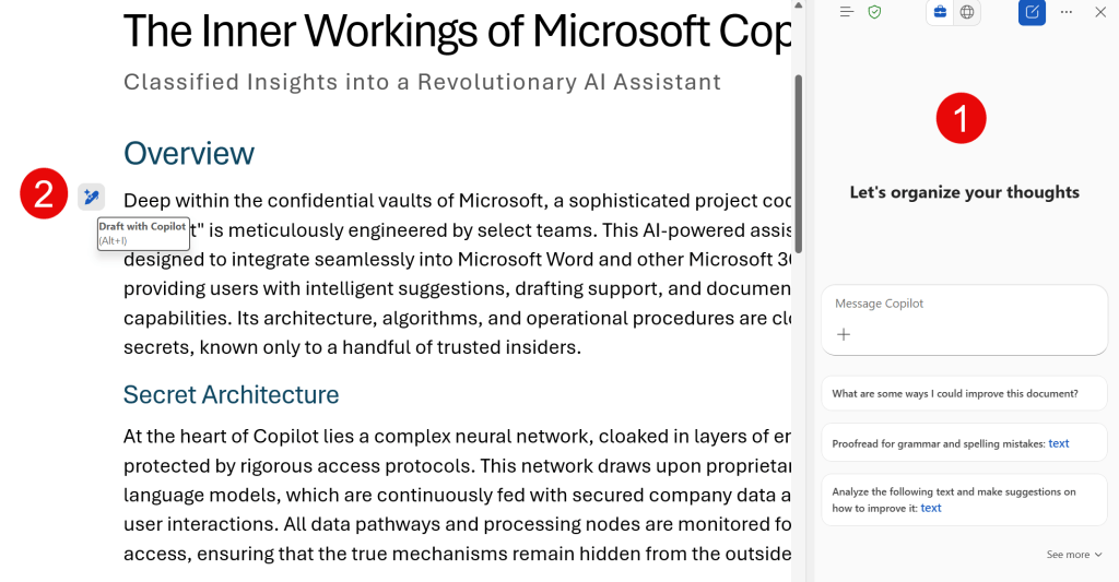 Now, to test all this goodness in action, I’ve drafted up a document called ‘The Inner Workings of Microsoft Copilot.docx’ about a mysterious AI-powered assistant. Note that this document is stamped with a sensitivity label called ‘Vertrouwelijk’, which is Dutch for ‘Confidential’.