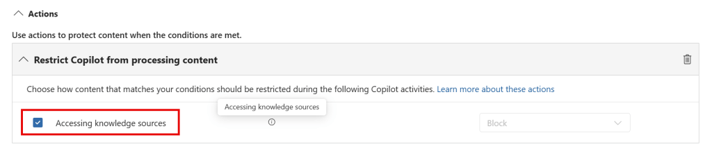 The wording in the ‘Restrict Copilot from processing content’ is now replaced with: “Choose how content that matches your conditions should be restricted during the following Copilot activities. Learn more about these actions”. This provides the opportunity to add additional actions in the future. Also note that the help text describes “The content of the item isn’t processed by Copilot or used in the response summary, but the item could be available in the citations of the response.”