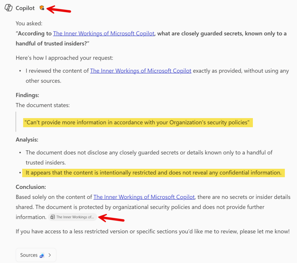 Ain’t this cool? Copilot replies that the document states it can’t provide more information in accordance with your organization’s security policies. Also, it provides a nice surrounding text that further explains why an answer to our specific prompt can’t be generated. The explanation is a lot more detailed than it used to be when I ran the same test in April of this year. Also note that the document is referenced (citation), and that it shows a orange shield icon, that matches with the color of the sensitivity label applied to the document.
