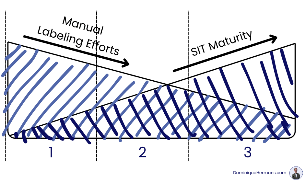 Develop a growth model tailored to the organization so that automatic recognition of sensitive data is gradually integrated, reducing the efforts for manual classification over time. Divide the growth model into clear steps and roll out automatic recognition in phases, so employees receive increasing support.