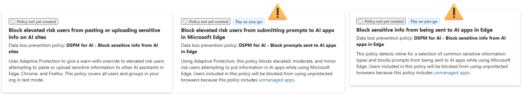 | Edge policy to block use of browsers where Purview DLP protections for unmanaged AI apps don’t apply | Blocks browsers where browser DLP is not supported. | DSPM for AI – Block prompts sent to AI apps in Edge DSPM for AI – Block sensitive info from AI apps in Edge |