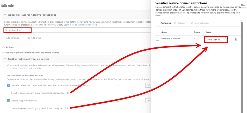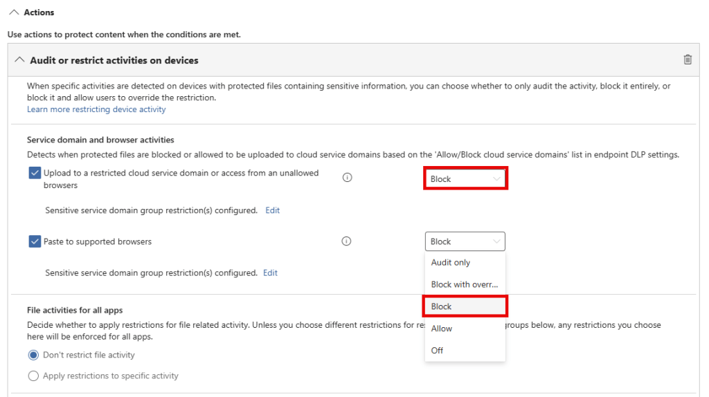 Make your way to the ‘Actions’ section, and configure ‘upload to a restricted cloud service domain’ and ‘paste to supported browsers’ to ‘block’. That’s all there is to it! Before enabling this policy, do note that it actually starts blocking the defined sensitive info from being uploaded or pasted to all supported generative AI sites.