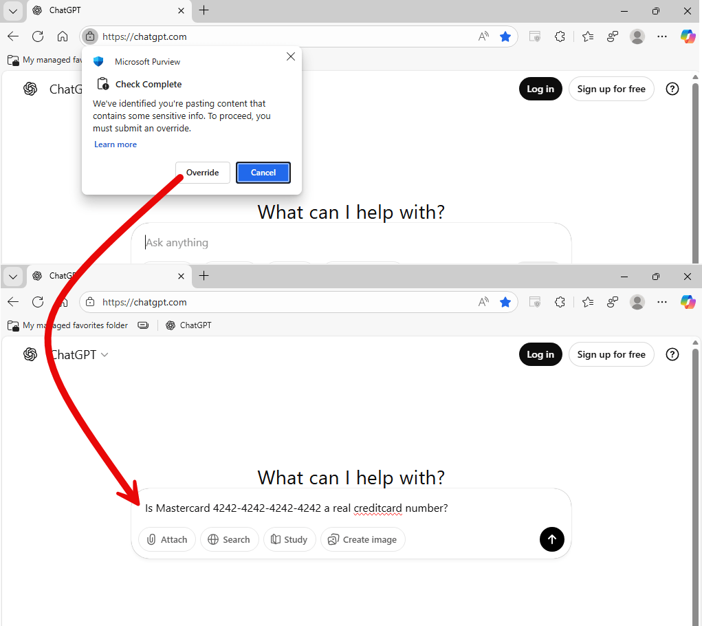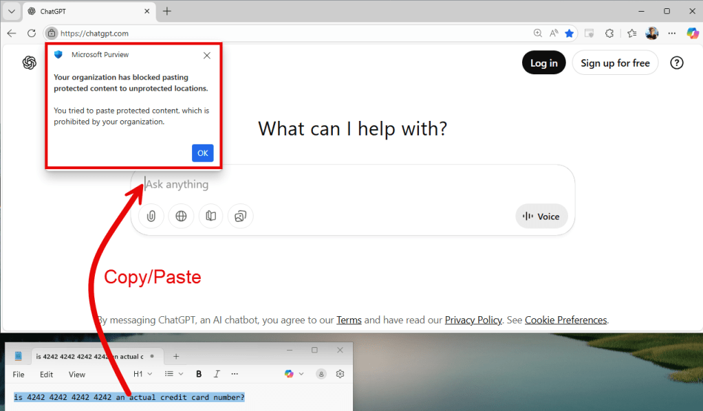 In general, Browser DLP can be used for stopping your users from sharing sensitive information to and from cloud apps in Edge for Business. This is possible for both managed clients (client is onboarded to Microsoft Purview) and unmanaged clients (client is not onboarded to Microsoft Purview, but user is logged into Edge for Business). To use it to protect sensitive data from ending up in unmanaged AI Apps like ChatGPT for example, we can only use managed clients. On top of the fact that the client has to be managed by Microsoft Purview, it also has to be managed by Microsoft Intune to be able to block a user from using other browsers that are not capable of blocking sensitive information from being shared to unmanaged AI apps.