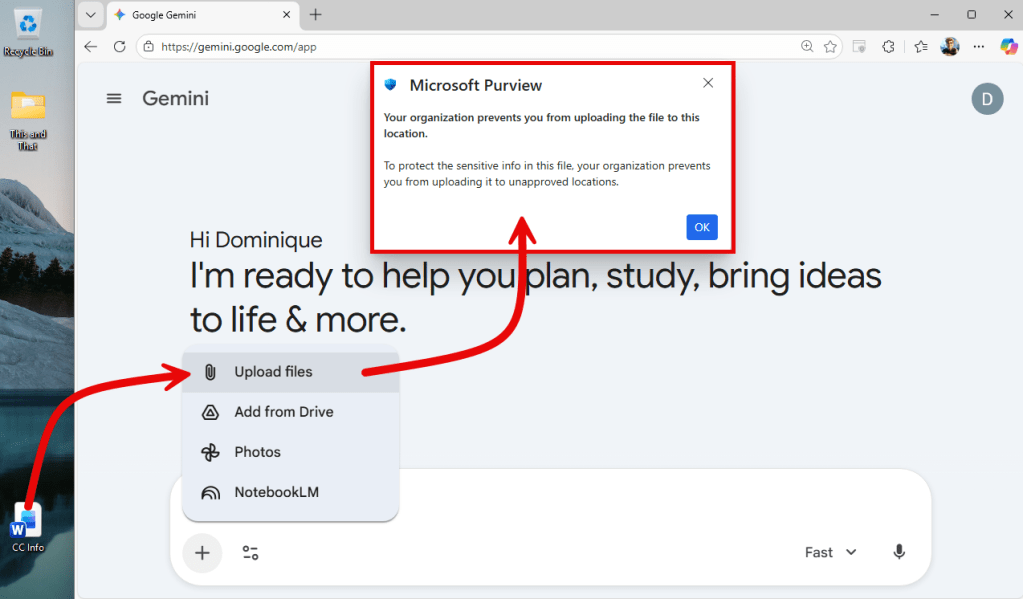 The same goes for uploading a document that contains sensitive information to a generative AI application (Google Gemini in this case). Mission accomplished!