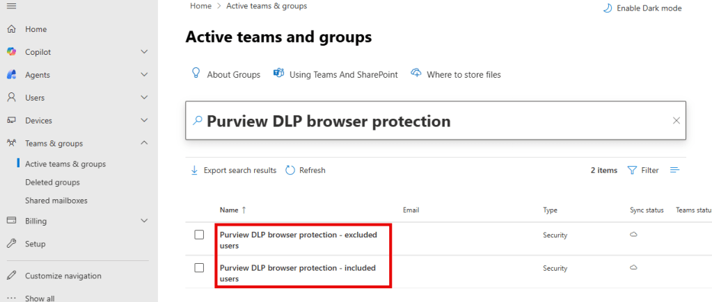 While in the M365 admin center, you can also see that there are 2 security groups created. “Purview DLP browser protection – included users” will include the users that will have Purview DLP browser protection enabled, and “Purview DLP browser protection – excluded users” will include the users that are explicitly excluded from the policy.