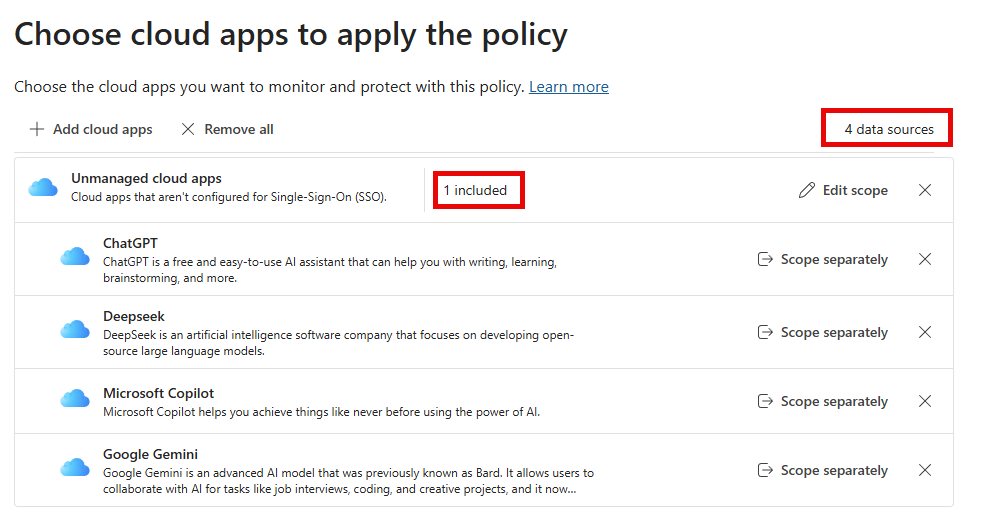 As you can see, the ‘DSPM for AI – Block sensitive info from AI apps in Edge’ policy is applied to the four GenAI Apps mentioned above. For scoping, you can choose to: