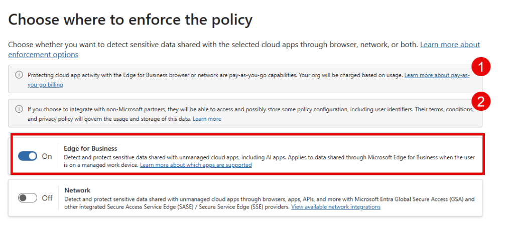In addition to browser DLP (‘Edge for Business’) we also have the possibility to deploy Network DLP, a feature that uses Microsoft Entra Global Secure Access (GSA) or another 3rd party Secure Access Service Edge (SASE) or Secure Service Edge (SSE) provider to monitor traffic and apply DLP policies. It is however worth mentioning that Network DLP supports over 34.000 Cloud apps as defined in the Microsoft Defender for Cloud Apps Cloud app catalog. So it’s fair to say that Network DLP is a feature worth a (or several) blogposts of it’s own. However, do note the 2 banners mentioning: