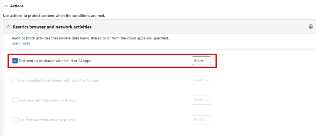 When looking at the specific action, it is configured to ‘block’ text sent to or shared with cloud or AI apps, which is exactly what we want to achieve.