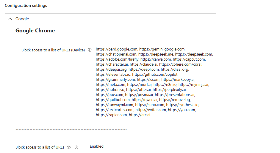 The second policy is used for Google Chrome only, and is able to block access to all GenAI apps that are secured with browser DLP in Edge, and therefore may not be used in Google Chrome.