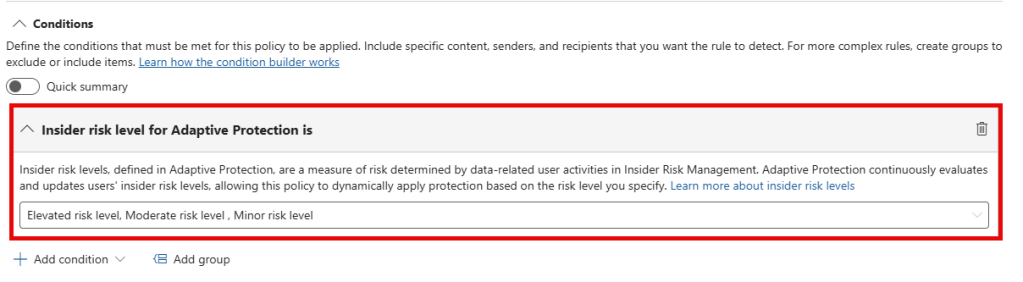 Last but not least, the ‘DSPM for AI – Block prompts sent to AI apps in Edge’ policy blocks all prompts sent to supported GenAI apps by users with an elevated risk score. There isn’t much different in this policy than the second DLP policy. I’ll highlight the differences.
