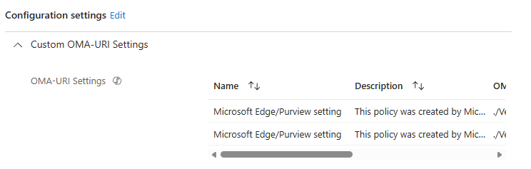 | 2: Microsoft Edge/Purview setting | This policy was created by Microsoft Edge/Purview | ./Vendor/MSFT/AppLocker/ApplicationLaunchRestrictions/MicrosoftEdgeManagement2/StoreApps/Policy | String (XML file) |