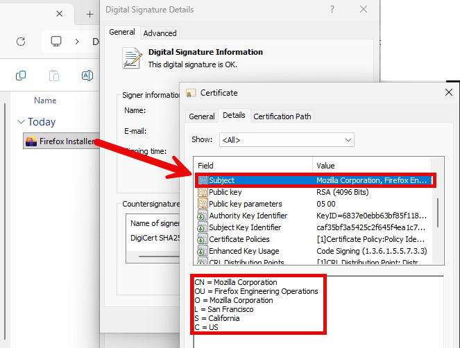 When the characteristics of Firefox in the ‘onlyEdgeRuleCollectionExe.xml‘ are compared with the characteristics of the Mozilla Firefox Installer, you can see we have a match: