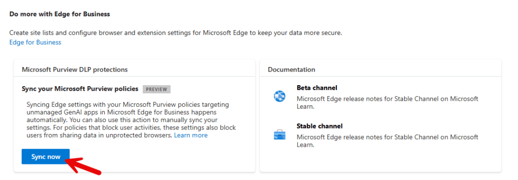 Another place where you can find a ‘sync now’ button is in the Microsoft 365 Admin Center, Settings, Microsoft Edge. This is always available, so you can use this when Purview thinks everything is A-OK.