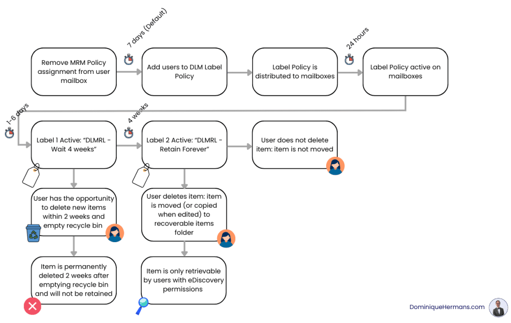 In the scenario described above, Exchange MRM policies can be replaced by Purview DLM policies. However, this is still far from possible in all cases due to differences in functionality. Time will tell whether the features we currently only have in Exchange MRM, such as moving items to an online archive, will eventually also become available through Purview DLM.