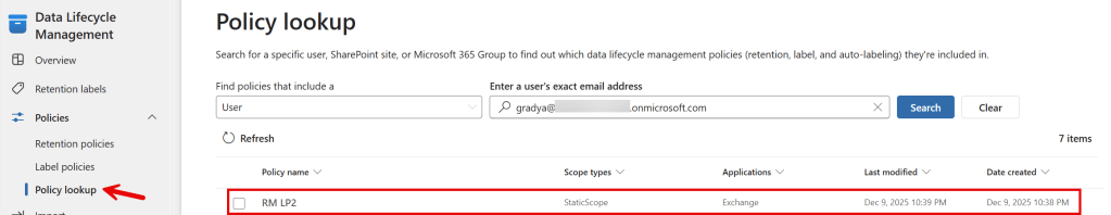 Navigate to Data Lifecycle Management, Policies, Policy Lookup and select a user of choice. Within a second you know whether your label policy has been distributed successfully to the user mailbox.