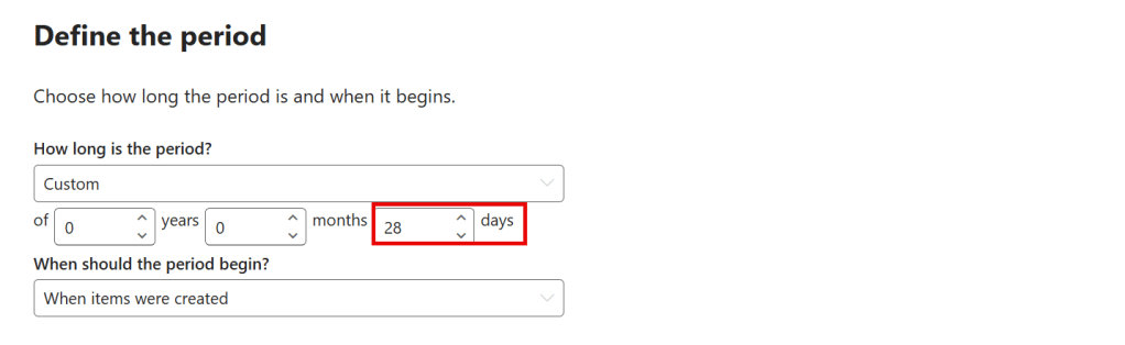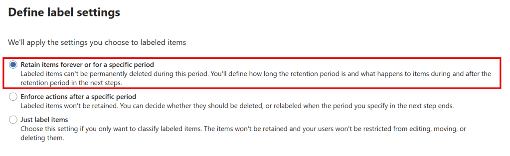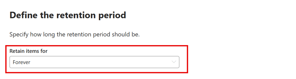 The requirement of our case was that items should be retained forever (after a 4 week waiting period), so that’s what we configure here by choosing ‘retain items forever or for a specific period’.