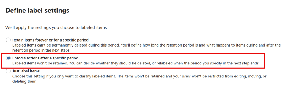 The label setting of choice for label 1 will be ‘enforce actions after a specific period’.