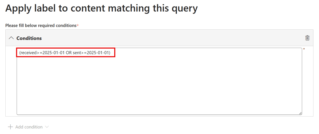 Next up, we’ll have to specify conditions that teach the system to what type of content the label should be auto-applied to. In our case we want all items that are received or sent after 2025/01/01. Take a look at the following Microsoft Learn article to see more properties you can use as conditions.